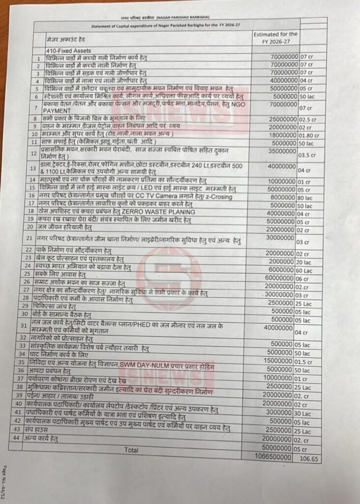 बरबीघा नगर परिषद ने वित्तीय वर्ष 2026-27 के लिए 106 करोड़ रुपये से अधिक का बजट तैयार कर एक बड़ा फैसला लिया है। बिहार नगरपालिका अधिनियम 2007 की धारा 84 के आलोक में तैयार इस बजट को बैठक के दौरान सदन में प्रस्तुत किया गया।