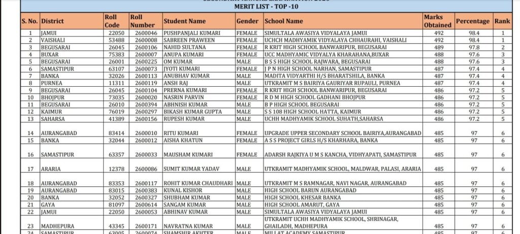 इस बार मेरिट लिस्ट में जमुई, वैशाली, बेगूसराय, बक्सर, समस्तीपुर, बांका, पूर्णिया और अन्य जिलों के छात्रों ने जगह बनाई है। खास बात यह रही कि टॉप-10 में अधिकतर छात्राएँ शामिल हैं, जिससे बेटियों का शानदार प्रदर्शन फिर सामने आया है।