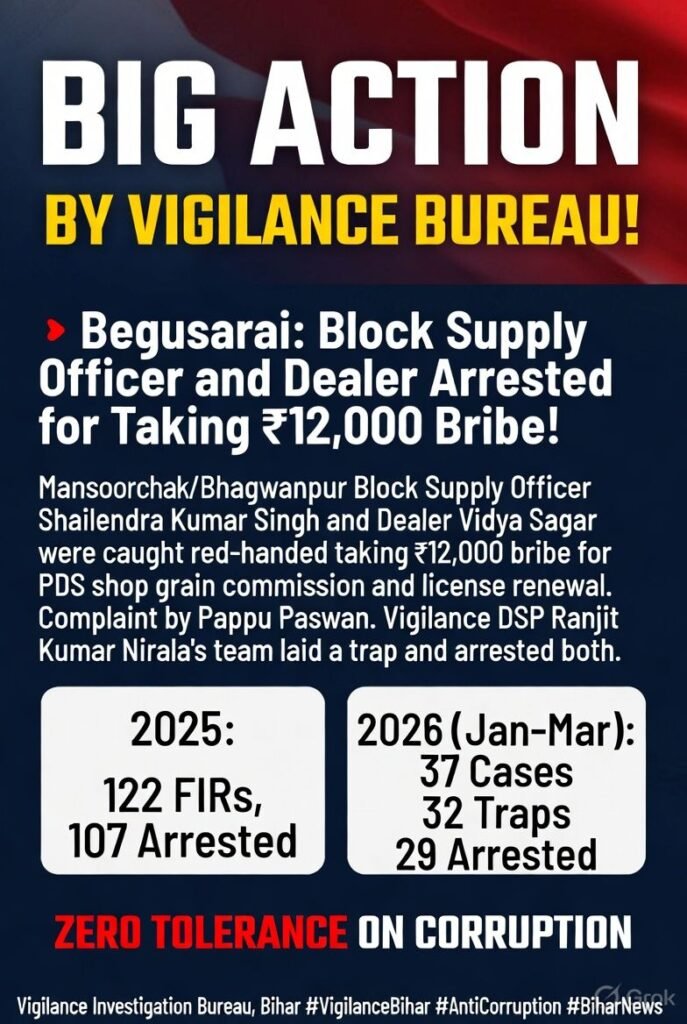 बेगूसराय में मंसूरचक और भगवानपुर प्रखंड के प्रखंड आपूर्ति पदाधिकारी शैलेंद्र कुमार सिंह तथा डीलर विद्या सागर को पब्लिक डिस्ट्रीब्यूशन सिस्टम की दुकान से जुड़े अनाज कमीशन और लाइसेंस नवीकरण के नाम पर बारह हजार रुपये रिश्वत लेते रंगे हाथ पकड़ा गया। पप्पू पासवान नामक व्यक्ति की शिकायत पर निगरानी डीएसपी रंजीत कुमार निराला की टीम ने जाल बिछाकर दोनों को दबोच लिया।